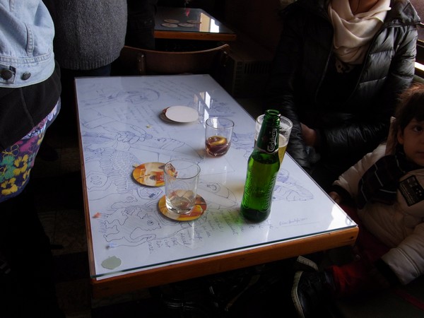 Vues de deux des dessins présentés sur les tables du café Le Combattant, lors du Feureu 2014, à Morlanwelz.