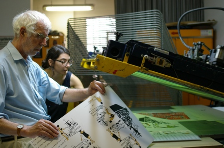 Symposium "Mare nostrum", août 2015, Schorndorf (Bade-Wurtemberg, Allemagne). Tirage de sérigraphies dans l'atelier d'Erich Schmidt.